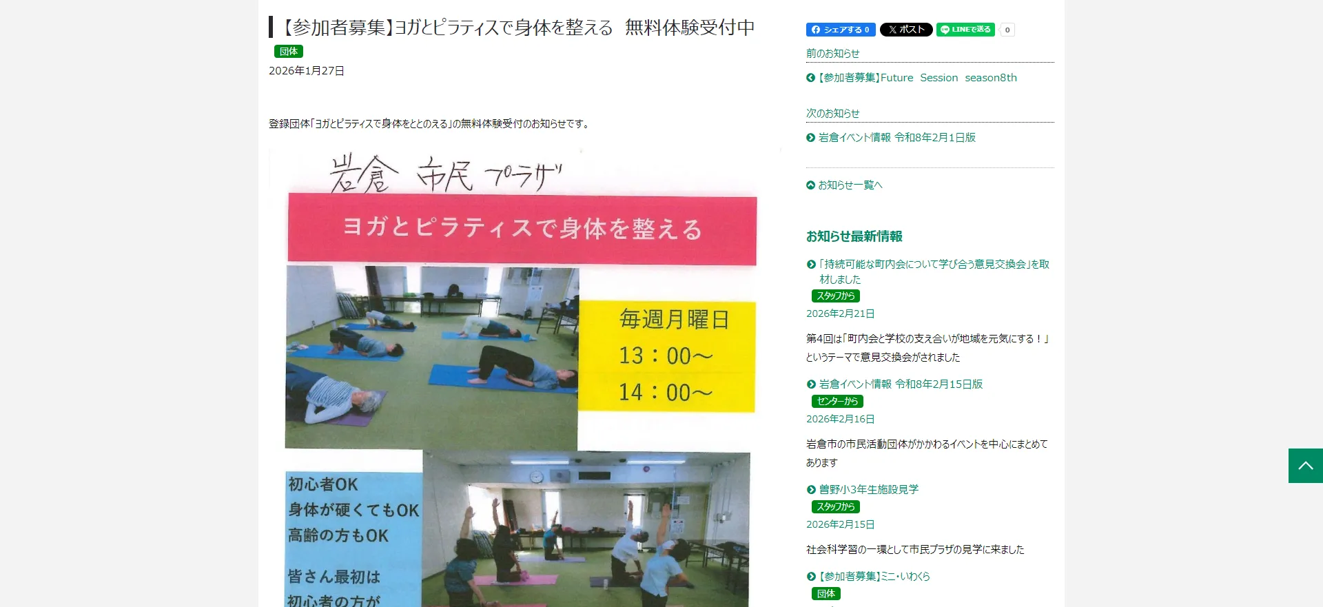 | 岩倉市民プラザ ヨガとピラティスで身体をととのえる | 公式サイト | 詳細は公式サイト参照 | 無料体験 | マットピラティス | グループ |