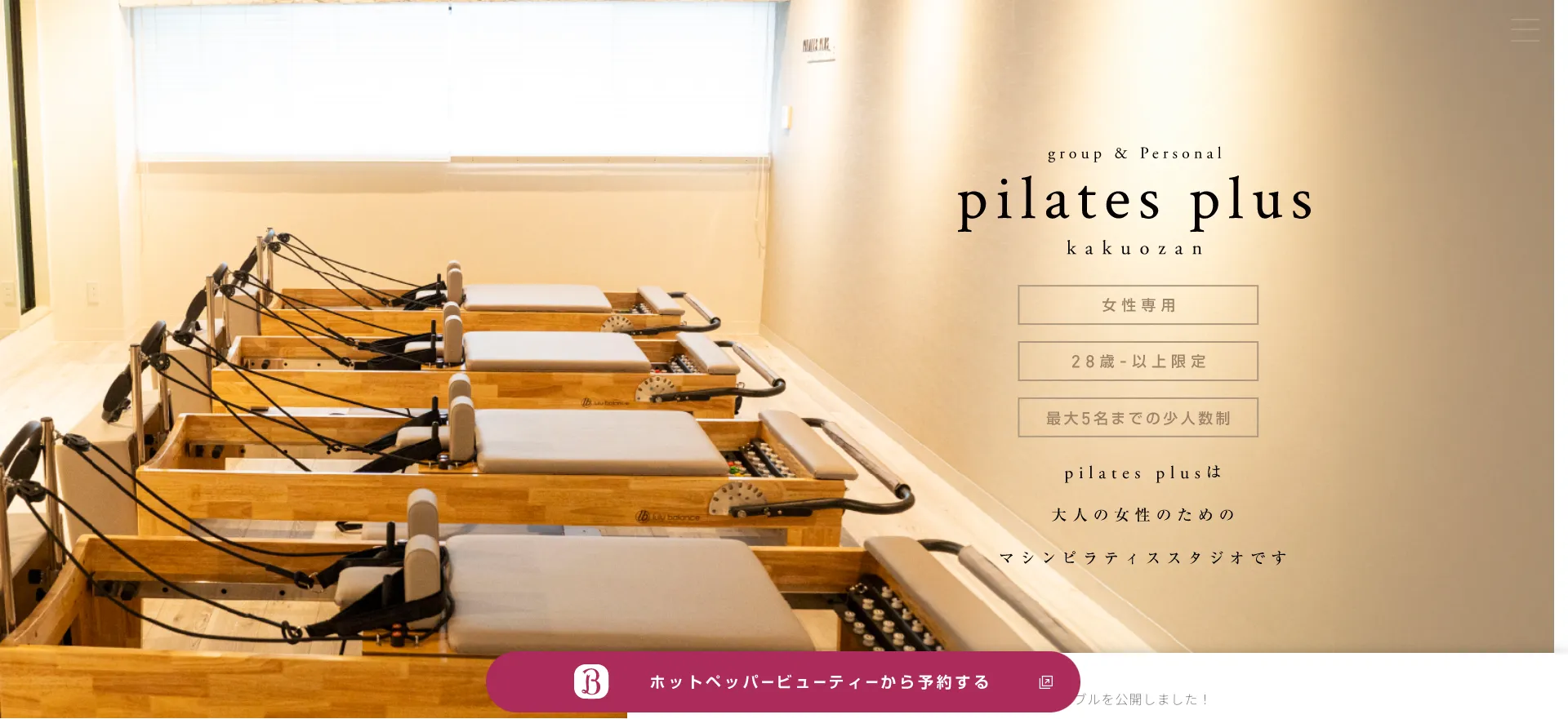 💡リーズナブルな料金で少人数の丁寧な指導を受けたい大人の女性に最適な、居心地の良いマシンピラティス専門スタジオです。