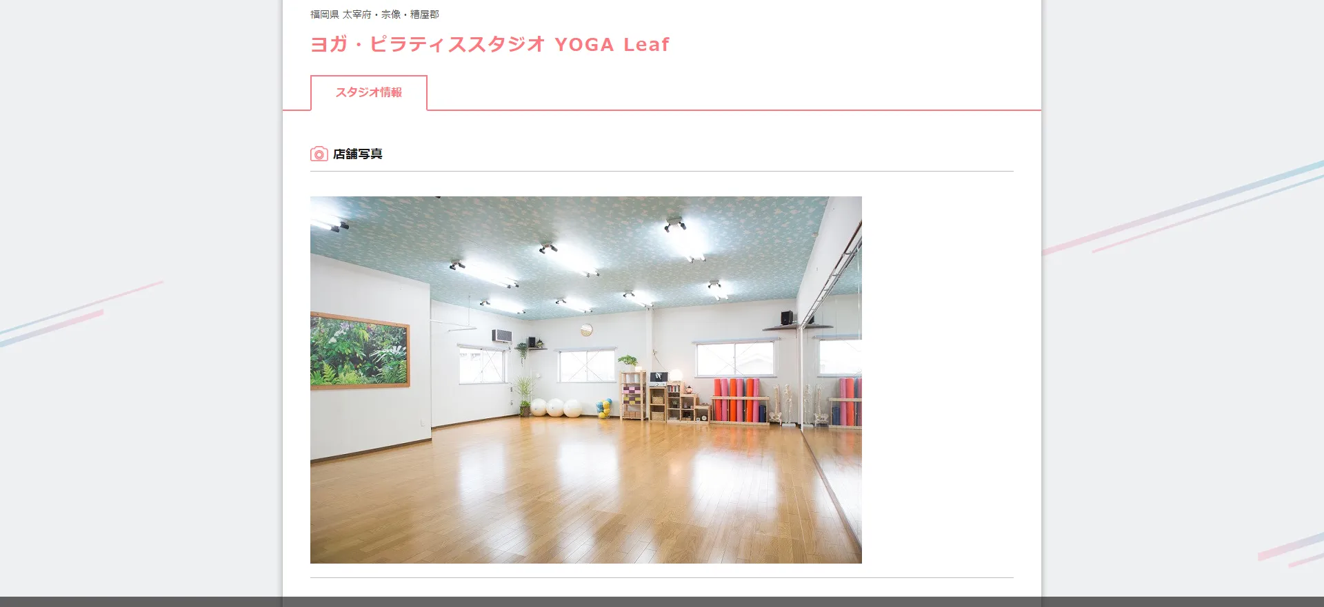 ・古賀駅から徒歩5分で通いやすい立地 ・ヨガとマットピラティスの両方に対応 ・SNSで情報発信が活発で雰囲気を事前に確認できる |