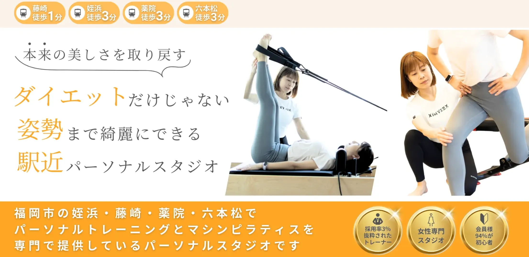 ピラティススタジオkuon 六本松店は、地下鉄七隈線六本松駅より徒歩1分の好立地にある、完全予約制のパーソナルピラティススタジオです。個別指導に特化しており、一人ひとりのニーズに合わせた丁寧なレッスンを提供しています。