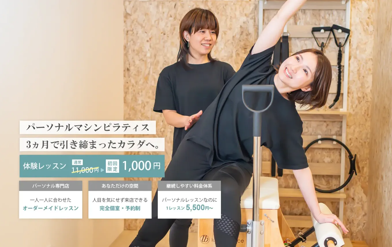 キャンペーン体験会0円・姿勢診断付き/入会金5,000円→0円/登録金5,000円→0円/マシンピラティス+ホットヨガ+暗闇キックボクシング通い放題プラン3ヶ月間月額1,980円(税込)(詳細は公式サイト参照)