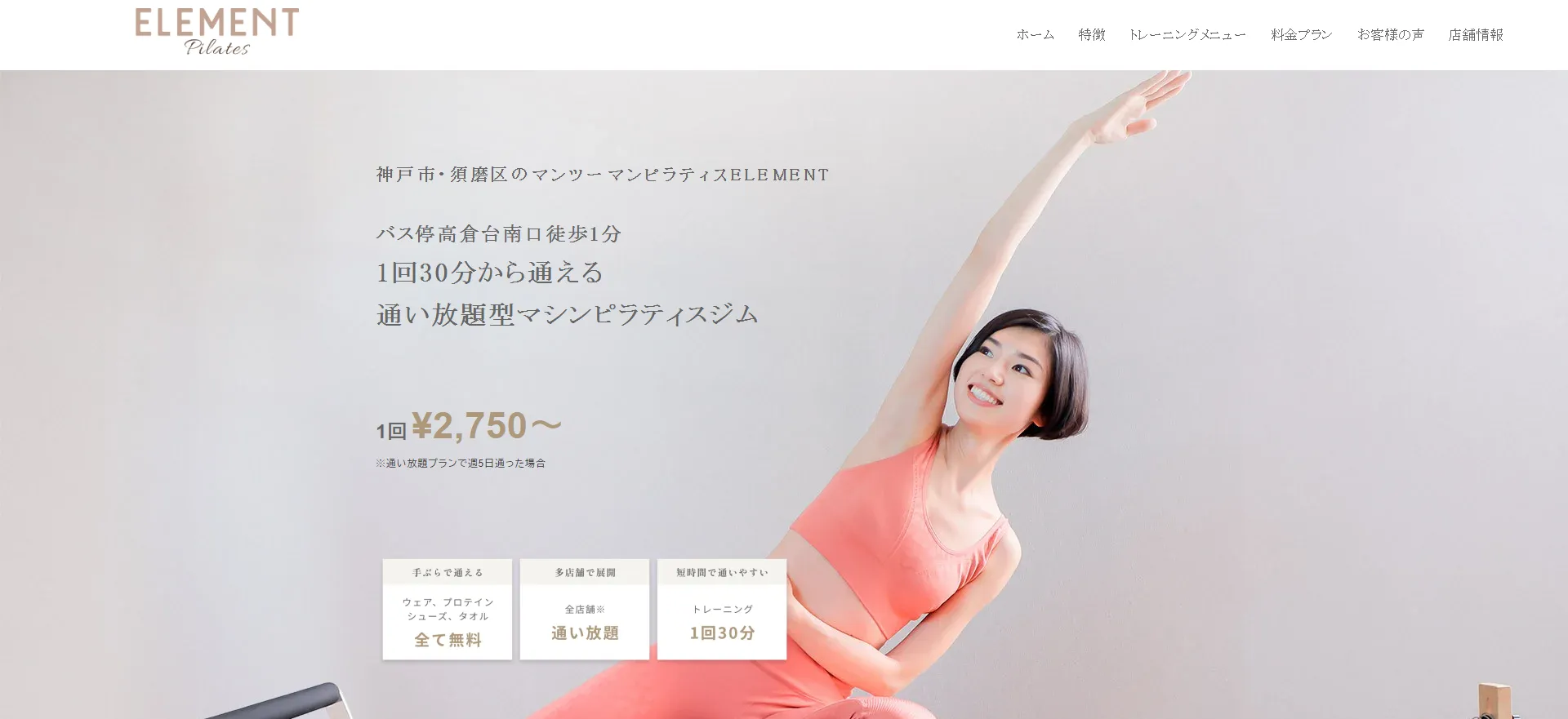 | ELEMENT 須磨店 | 公式サイト | 月額34,800円〜 | – | マシンピラティス | パーソナル |