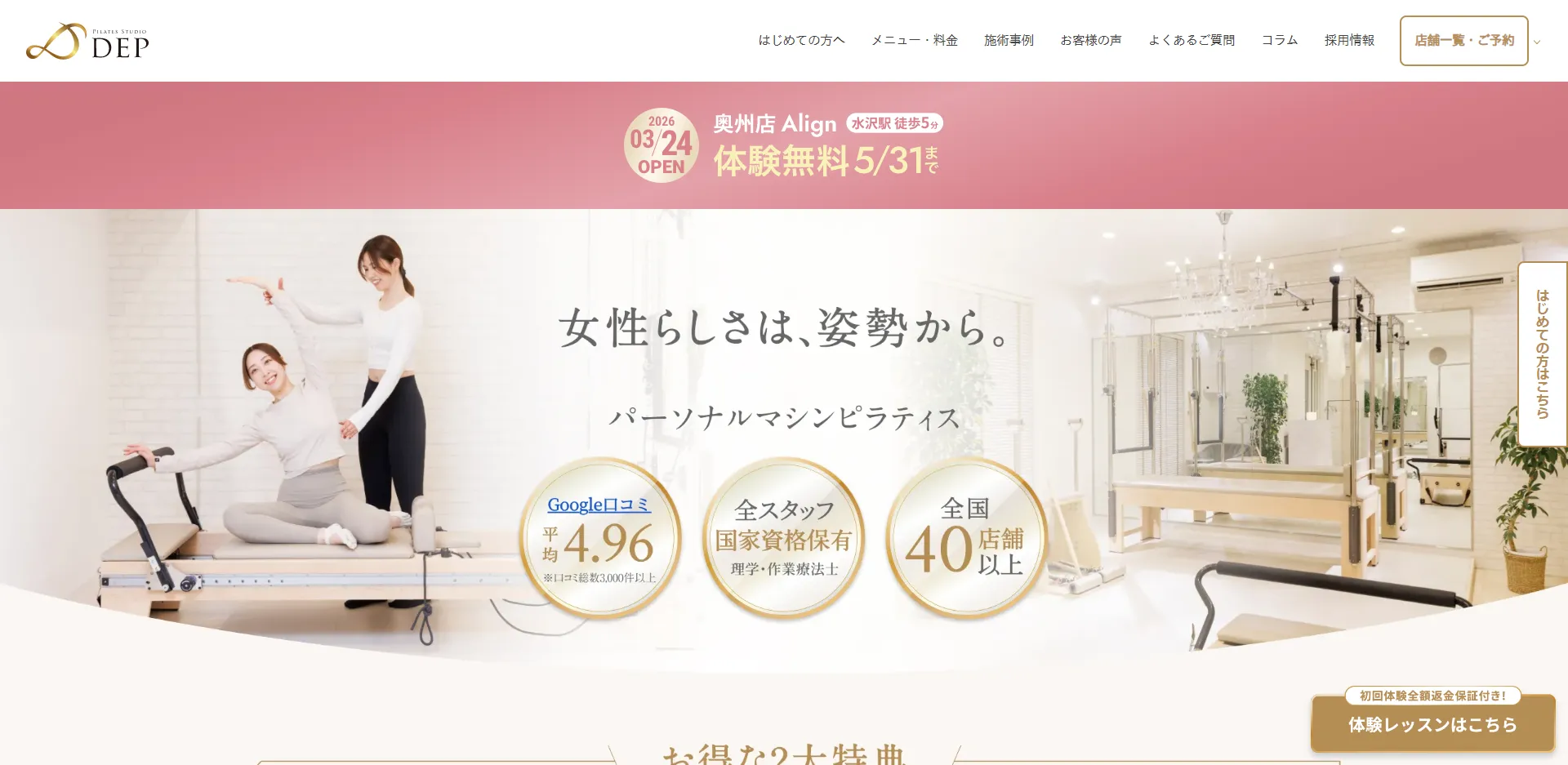 | ピラティススタジオDEP 奥州店 Align | 公式サイト | 月額14,800円〜 | 2,980円(条件あり) | マシンピラティス | パーソナル |