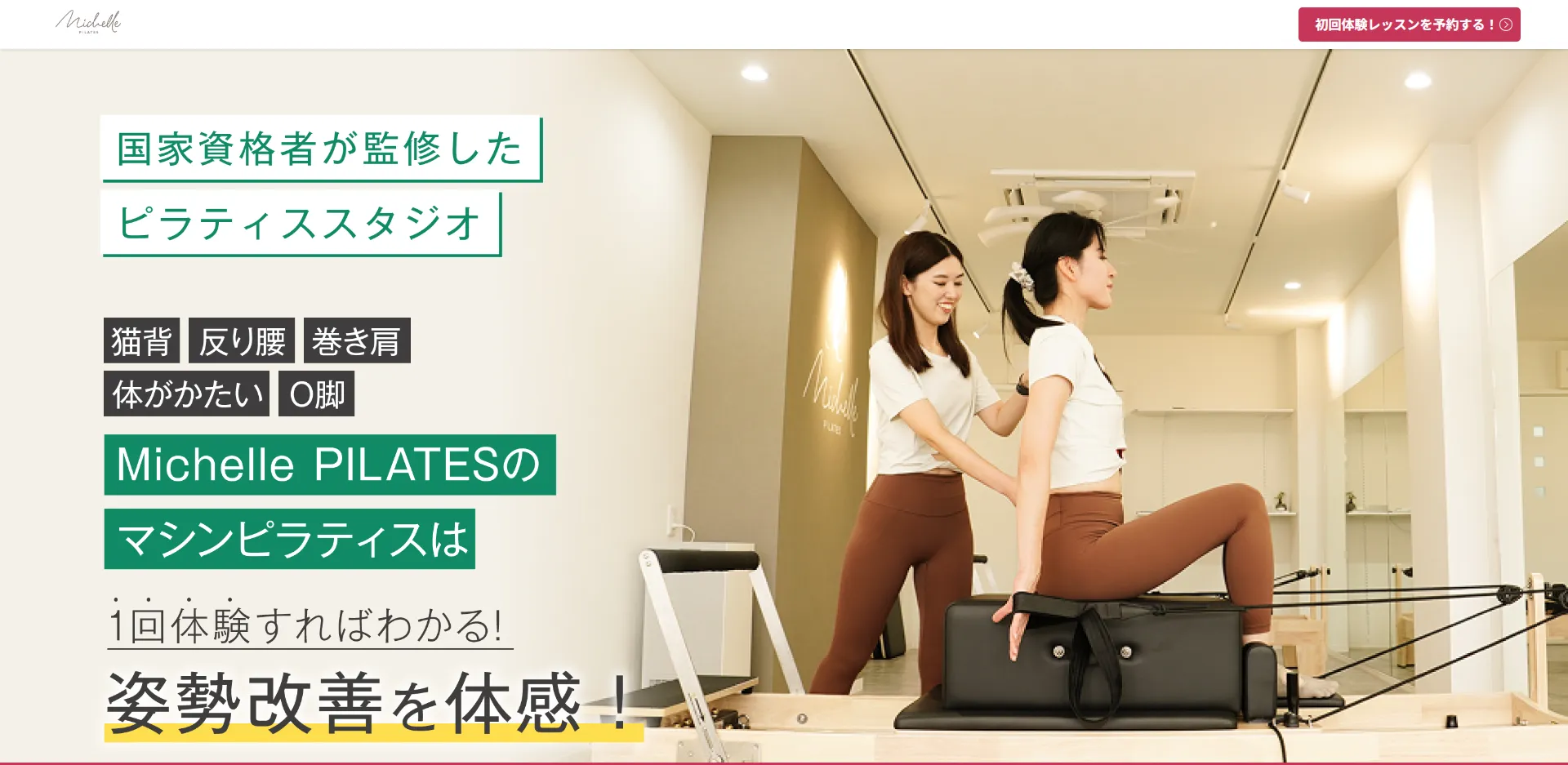 ミッシェルピラティス 公式サイト 月4回:15,400円〜 2,026円(キャンペーン) マシンピラティス 少人数・パーソナル ・国家資格者(柔道整復師・鍼灸師)監修の姿勢改善・体の歪み特化プログラム