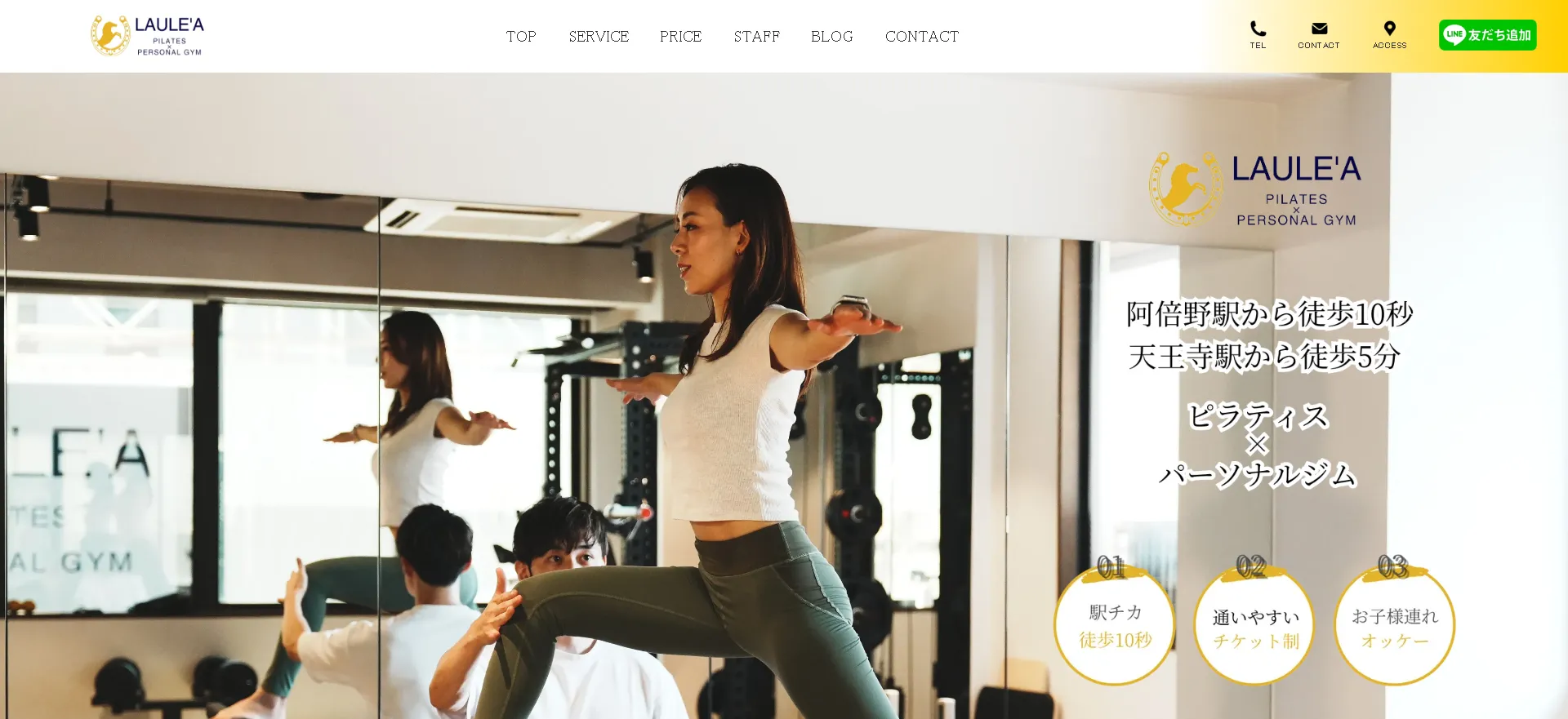 大阪メトロ谷町線「阿倍野駅」から徒歩わずか10秒、JR天王寺駅から徒歩5分という驚異的なアクセスの良さを誇るピラティス&パーソナルジムです。ハワイ語で「幸せ」を意味する「LAULE’A(ローレア)」のコンセプトのもと、ピラティスとウエイトトレーニングを組み合わせた完全オーダーメイドのパーソナルレッスンを提供。個人レッスン・ペアパーソナル・少人数グループ(最大4名)から選べるなど、柔軟なレッスン形式が特徴です。代表自らが指導にあたるアットホームな雰囲気で、ダイエット・姿勢改善・健康維持など、さまざまな目的に対応しています。