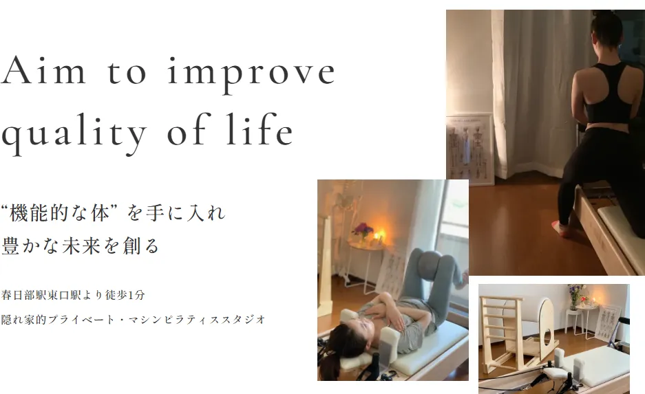 春日部駅東口改札から徒歩1分という抜群のアクセスを誇るマシンピラティス専門スタジオです。指導歴20年、指導実績1万人以上の経験豊富なインストラクターが、自身の怪我の回復経験からピラティスの本質を追求し、振り付けではない心と体を満たす豊かなピラティスを提供しています。『完全個室』の隠れ家的スタジオです。 また、マシンの他マット、フットセラピー(足の筋膜セラピー)、近隣スタジオにてグループレッスン(マット)も行っています。駅直結の利便性と高い専門性から人気が高く、現在は満員につき新規予約を一時停止しているほどの人気ぶりです。少人数制のセミパーソナルスタイルで一人ひとりに丁寧な指導が行き届き、初心者から経験者まで安心して通えるアットホームな雰囲気が魅力のスタジオです。