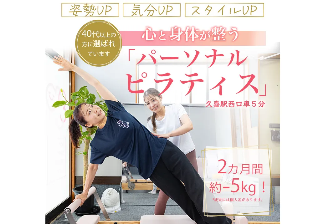 久喜駅西口から車で5分・徒歩20分の場所にある、完全個室のパーソナル専門ピラティススタジオです。地上波TV番組「ガールズハッピースタイル」で2025年の年間最優秀賞を受賞した実績があり、お客様継続率90%以上と高い満足度を誇ります。会員様の半数以上が40~60代で、初心者や運動が苦手な方でも安心して通える「居心地の良さ」を大切にしたアットホームな雰囲気が特徴。マシンピラティスとマットピラティスの両方に対応し、ウェア・マット・タオル・飲み物が毎回無料でレンタルできるため、手ぶらで気軽に通えます。専用駐車場完備で車での来店も便利です。