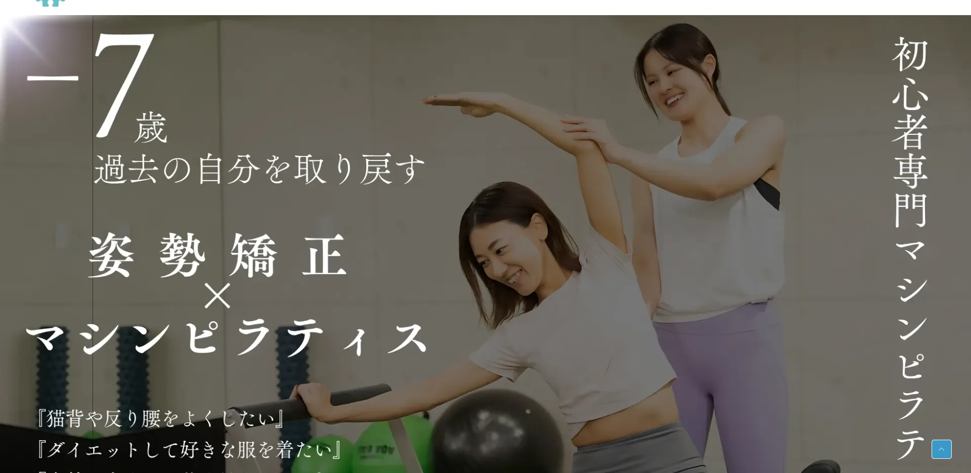 | 料金プラン | マシンピラティス40分:5,000円/オプション30分:4,000円/オプション15分:2,000円/全身美容矯正×ピラティス105分:通常11,500円・5回券50,600円(1回あたり10,120円、有効期限5ヶ月) |