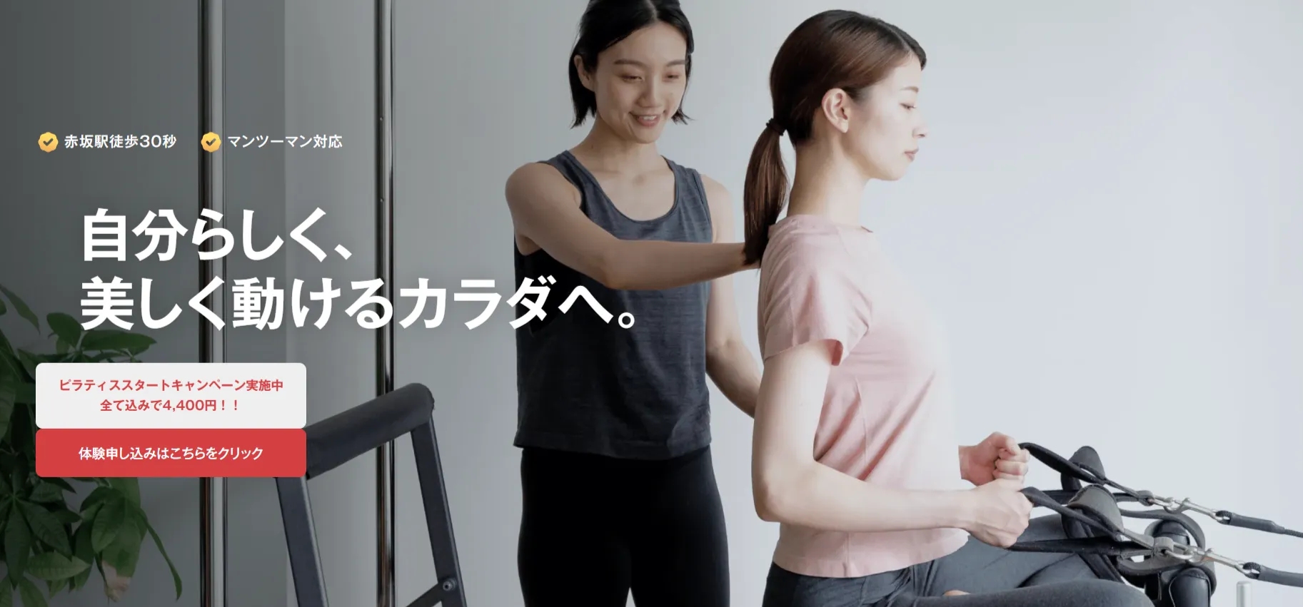 スタジオトーチ赤坂は、「姿勢とバランスを整え美しく生涯健康で動けるカラダづくり」をコンセプトにしたピラティス&パーソナルトレーニングスタジオです。赤坂駅から徒歩30秒という超駅近の完全予約制・完全マンツーマンスタジオで、一人ひとりに合わせたオーダープログラムで身体のお悩みを解決していきます。確かな知識と技術を持つインストラクターによる丁寧なフォローアップが特徴です。