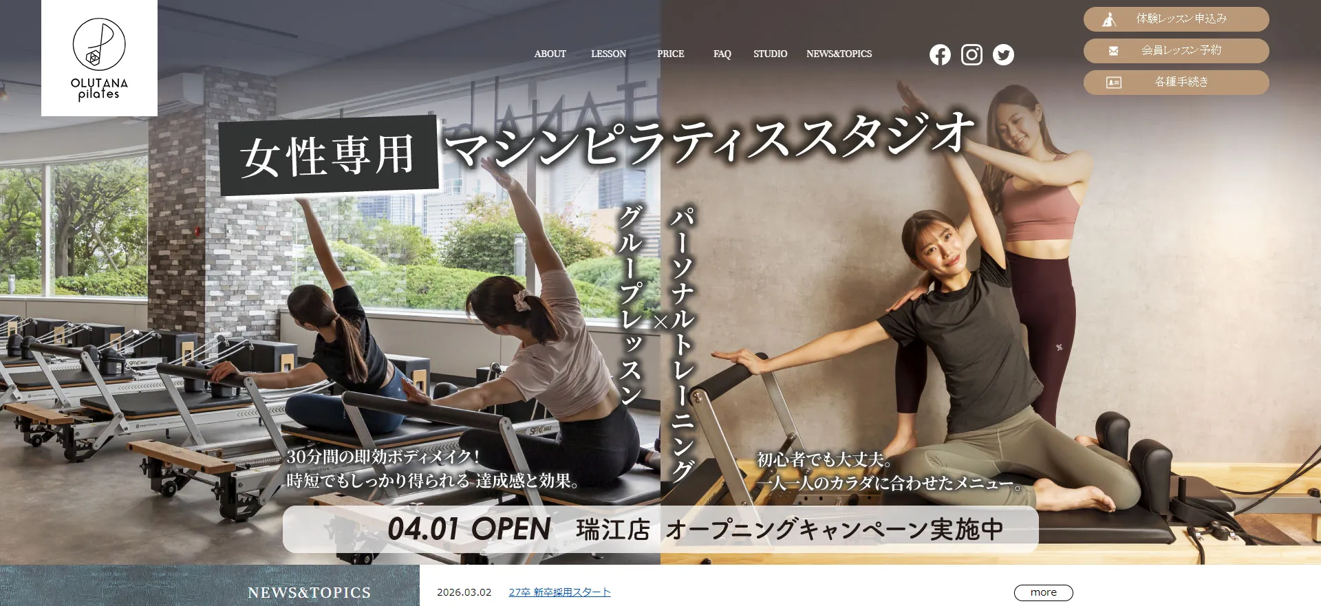 | OLUTANA pilates 東雲店 | 公式サイト | 月額11,000円〜 | – | マシンピラティス | グループ |