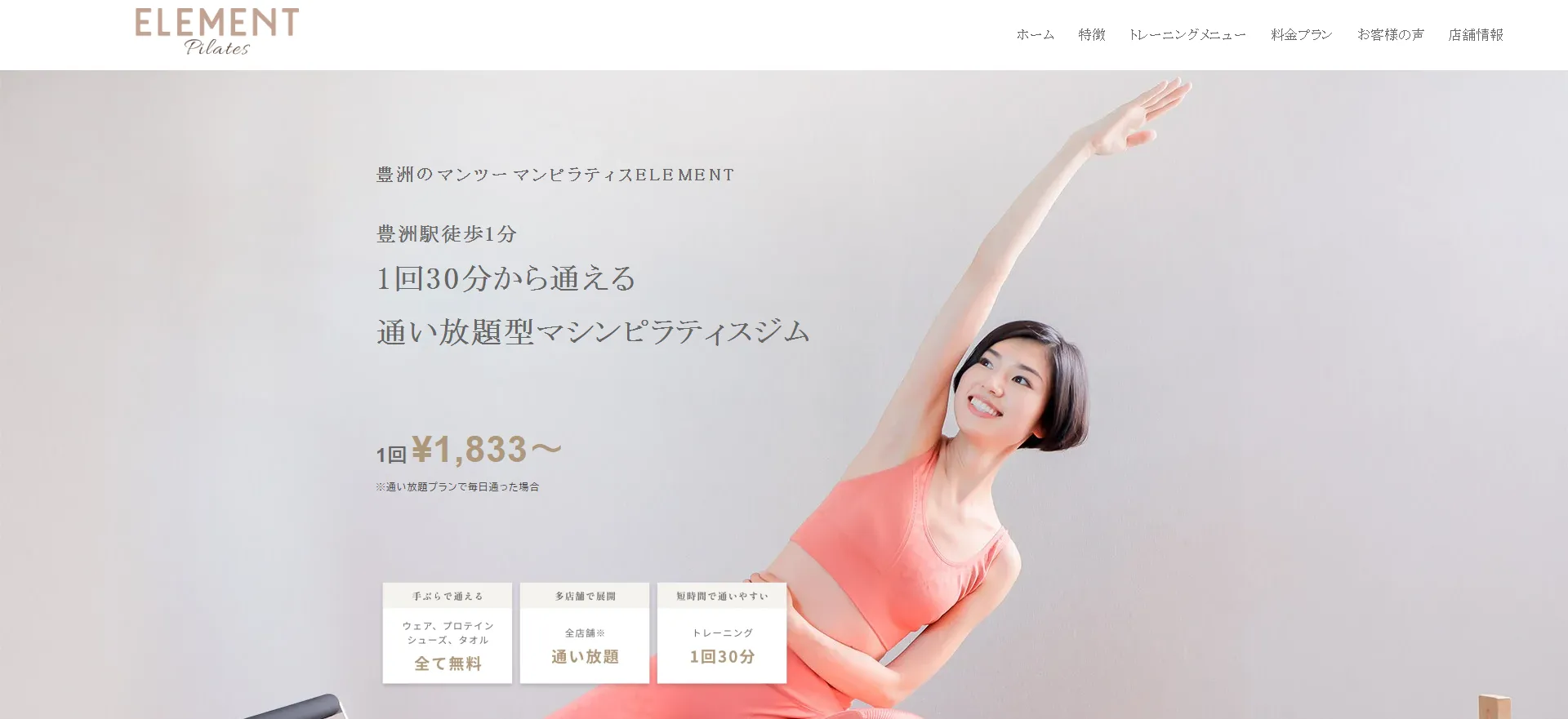 豊洲駅から徒歩わずか1分の好立地にある、1対1のマンツーマン指導に特化したマシンピラティスジムです。入会する90%が運動初心者という敷居の低さが魅力で、科学的・医学的根拠に基づいた指導が受けられます。1回30分からの通い放題型プランを採用しており、週2〜3回の継続でボディラインの変化を実感できると好評。ウェア・タオル・ドリンク・プロテインがすべて無料レンタルで手ぶらで通えるのも、忙しい社会人や主婦に支持される理由のひとつです。