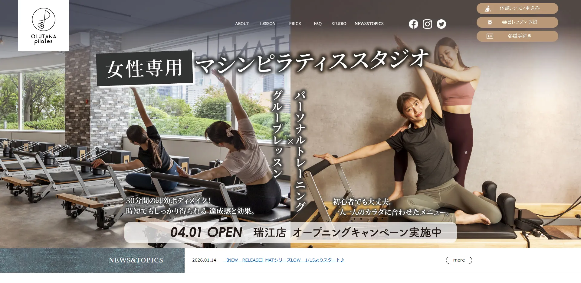 OLUTANA pilates 五反野店 公式サイト 月額8,800円〜 5,500円 マシンピラティス グループ・パーソナル ・五反野駅から徒歩1分と駅近で通いやすい立地