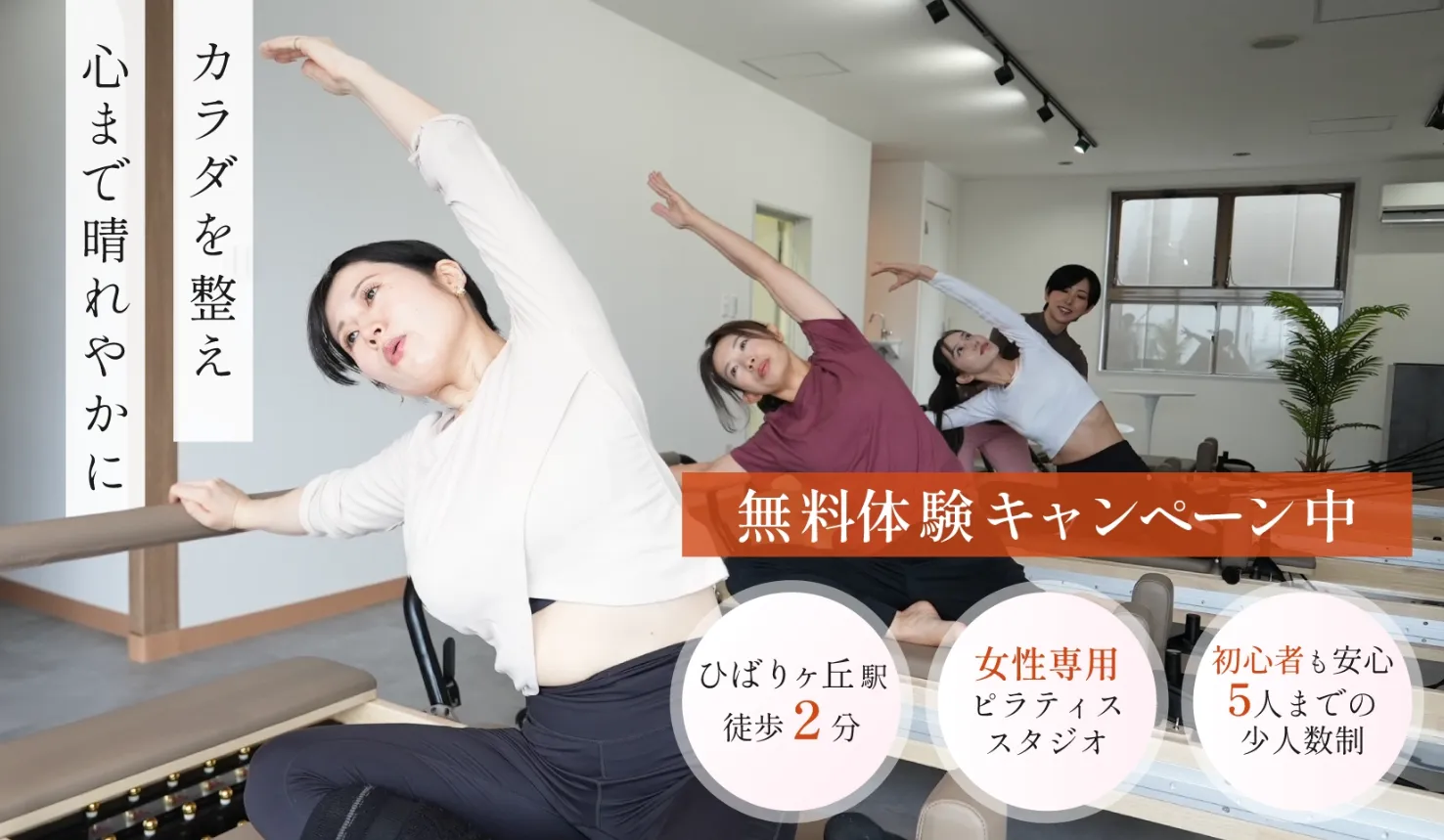 ひばりヶ丘駅から徒歩2分、女性専用の少人数制マシンピラティススタジオです。最大5名までの少人数レッスンで、インストラクターが一人ひとりをしっかりサポート。男性の目を気にすることなく、リラックスしてレッスンに集中できる女性のための安心空間を提供しています。肩こり・腰痛などの不調改善から美しい姿勢づくり、ボディメイクまでトータルにサポートし、初心者でも無理なく続けられるプログラムが特徴。新規オープンを記念した先着50名様限定の特典も実施中で、体験レッスン無料や入会金無料など、お得に始められるチャンスです。