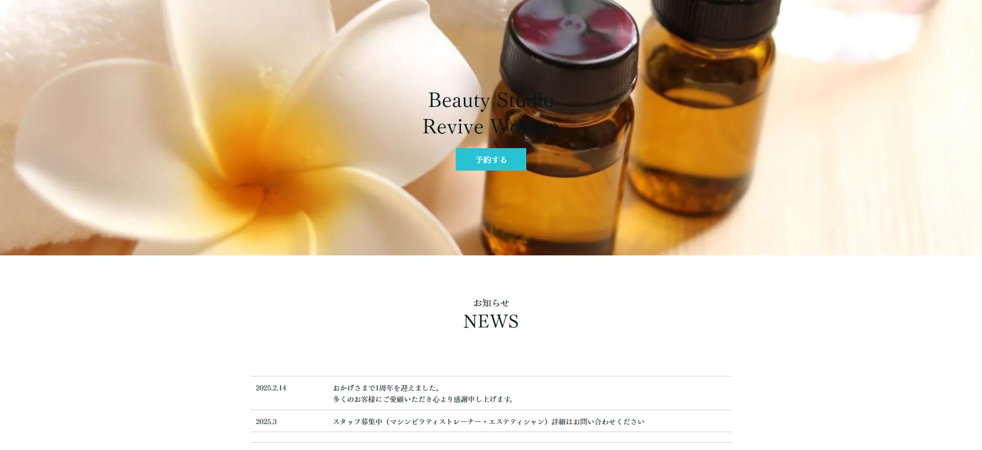 | 料金プラン | マシンピラティス(マンツーマン50分)初回:4,500円〜/エステ初回:7,200円〜/岩盤浴(50分)初回:3,000円〜(いずれも税込) |