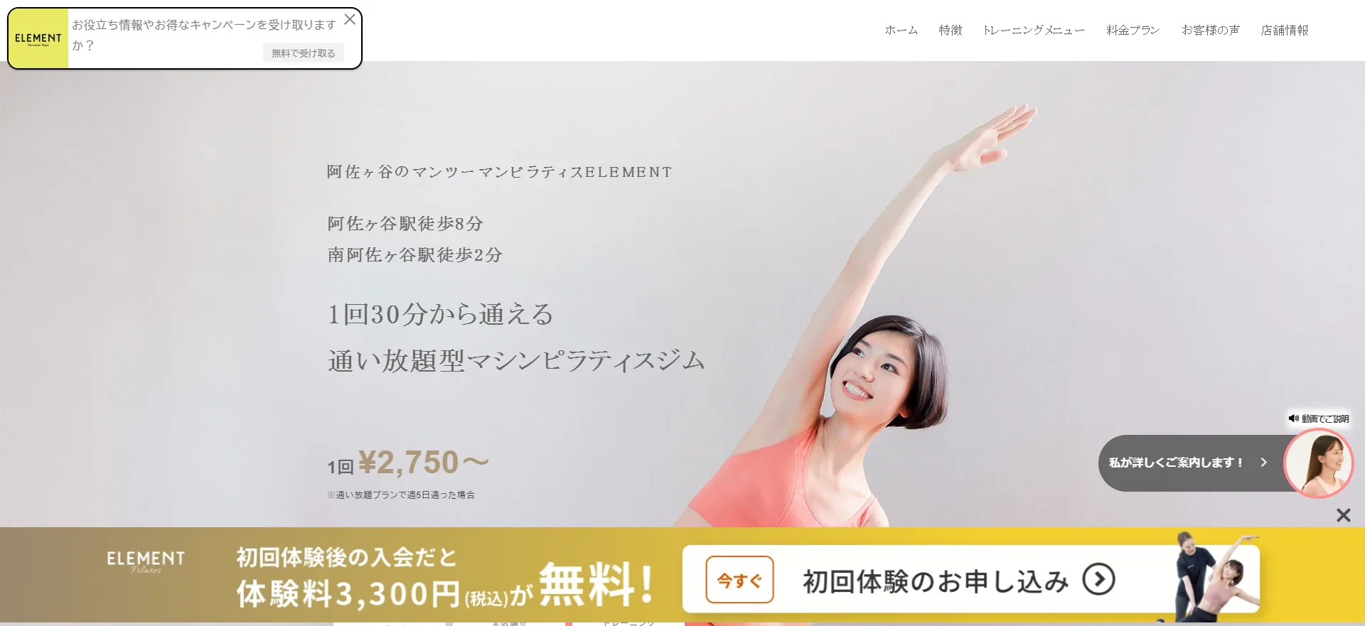 東京を中心に60店舗以上を展開する通い放題型マシンピラティス専門スタジオ「ELEMENT」の阿佐ヶ谷店。東京メトロ丸ノ内線・南阿佐ヶ谷駅から徒歩2分、JR阿佐ヶ谷駅から徒歩8分と、ふたつの路線から通えるアクセスの良さが特徴です。マンツーマン(1対1)のパーソナル指導を月額制の通い放題で提供するという業界では珍しいスタイルを採用しており、通えば通うほど1回あたりの費用が下がります。1回30分からの短時間レッスンで、仕事や家事のスキマ時間を活用して無理なく通えます。入会者の90%が運動初心者で、ウェア・タオル・ドリンク・プロテインが無料レンタルできる手ぶら通いも可能。LINE登録で入会金33,000円と体験料3,300円が無料になるキャンペーンも実施中です。