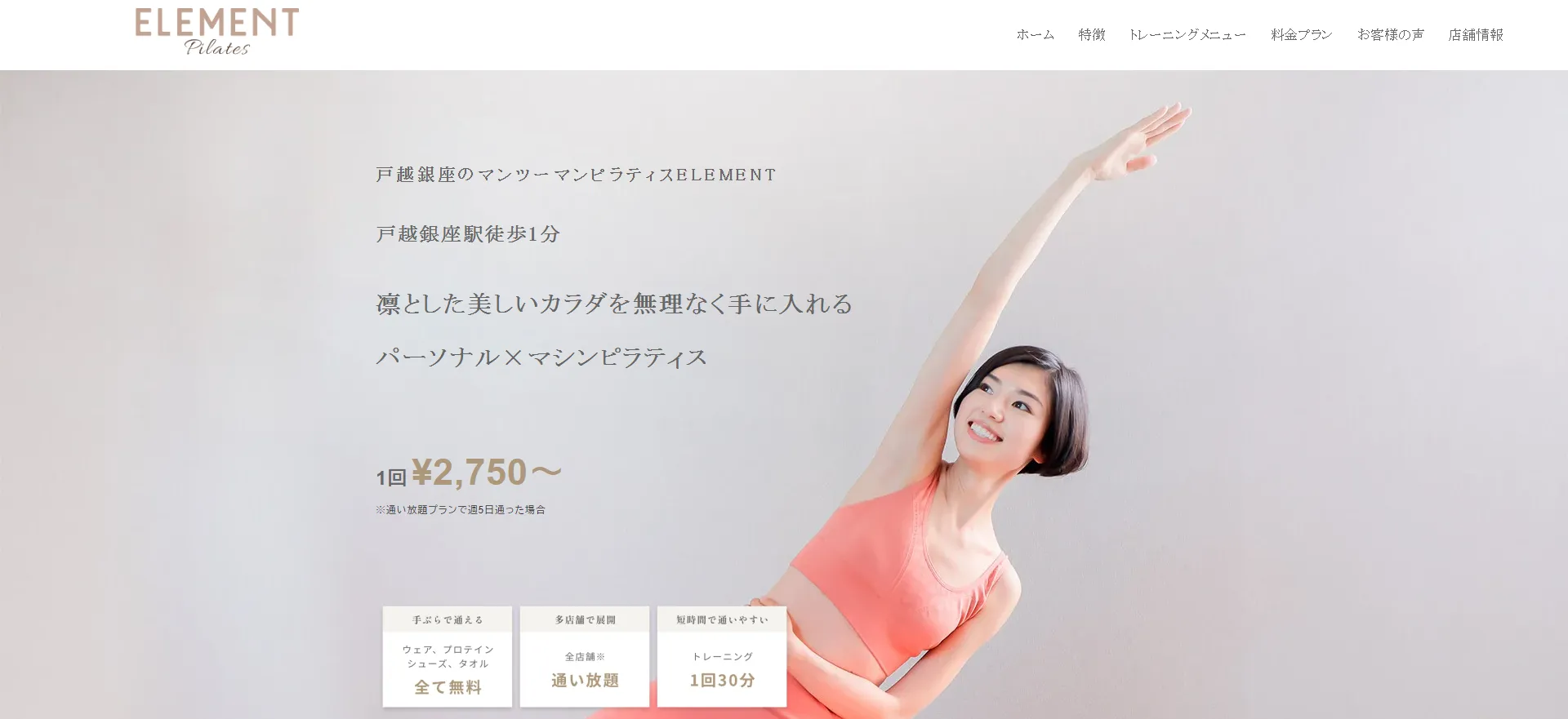 | ELEMENT 戸越銀座店 | 公式サイト | 月額22,000円〜 | 3,300円 | マシンピラティス | パーソナル |